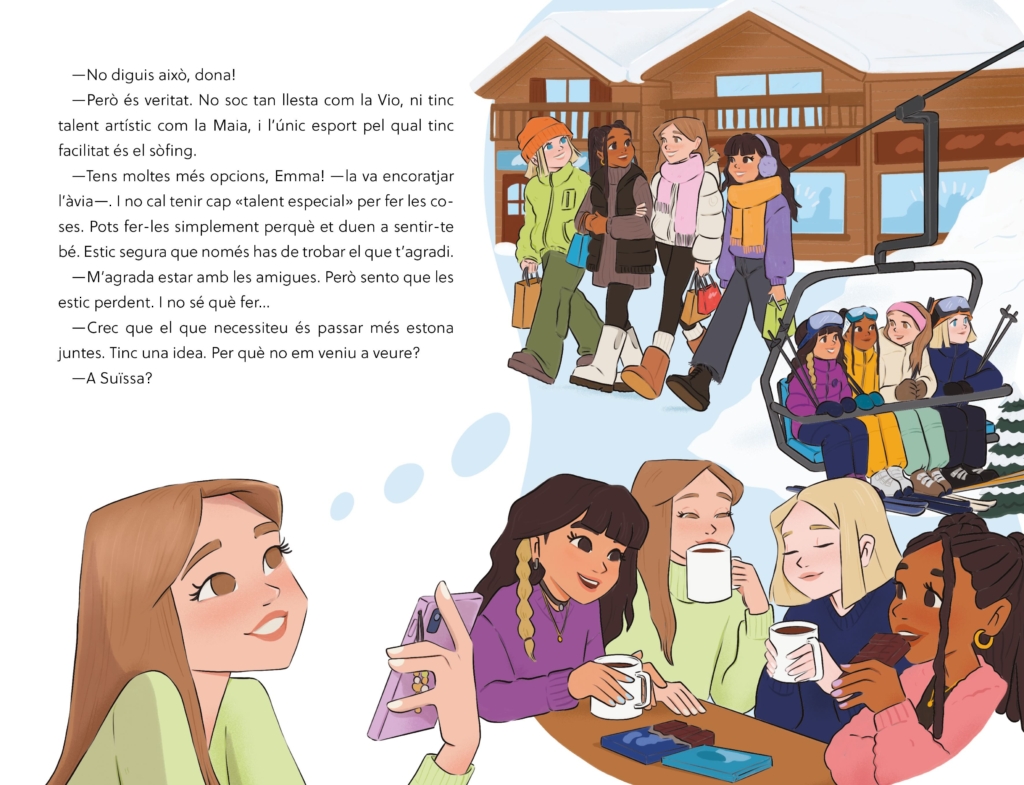 L’Emma, la Nessa, la Vio i la Maia sempre han anat juntes a classe… fins ara! Quan les separen a principi de curs, l’Emma sap que ha de fer alguna cosa per mantenir el grup unit, així que marxen uns dies al petit hostal de la seva àvia, als Alps suïssos. Estan decidides a passar-ho bé, però allà els problemes no s’acaben! Un hotel de luxe està acabant amb els comerços locals i posa en perill el negoci de l’àvia, la Maia coneix un noi molt especial i les amigues oculten més d’un secret… La seva amistat podrà superar totes aquestes proves?